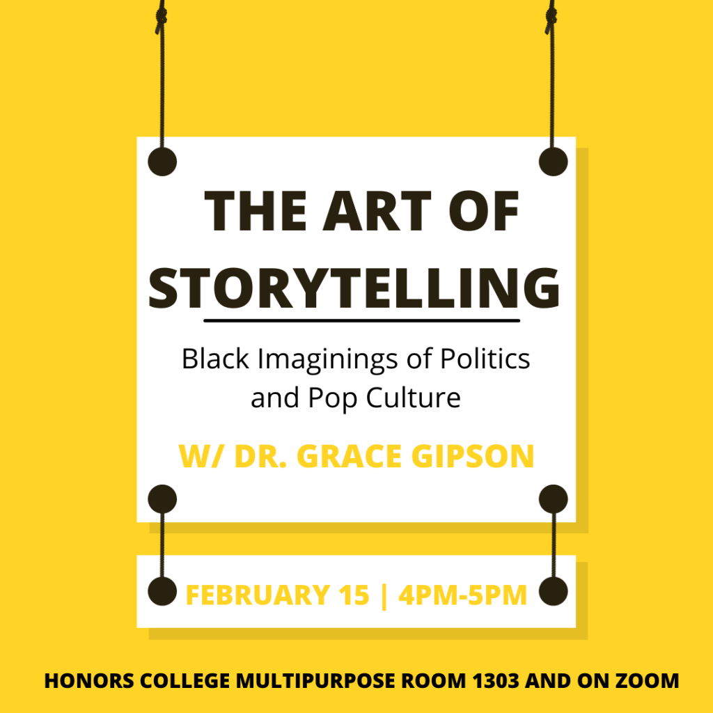 *February 15th, 2022 (4 pm/ET)- “The Art of Storytelling: Black Imagining of Politics and Pop Culture”, [Featured Series Speaker], Berglund Seminar Series-Virginia Commonwealth University-Honors College (Richmond, VA)…Registration TBA