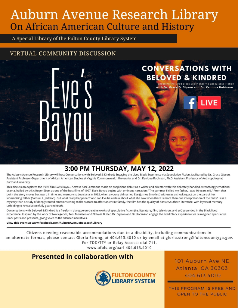 Tune in on this Thursday May 12th at 3 pm/ET as Dr. Robinson and I continue our discussion n Blackness and horror with a discussion on the 1997 film, Eve’s Bayou!!